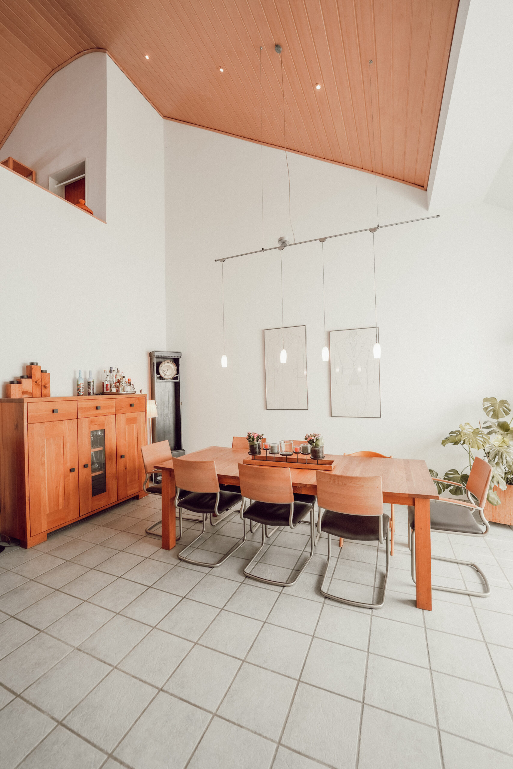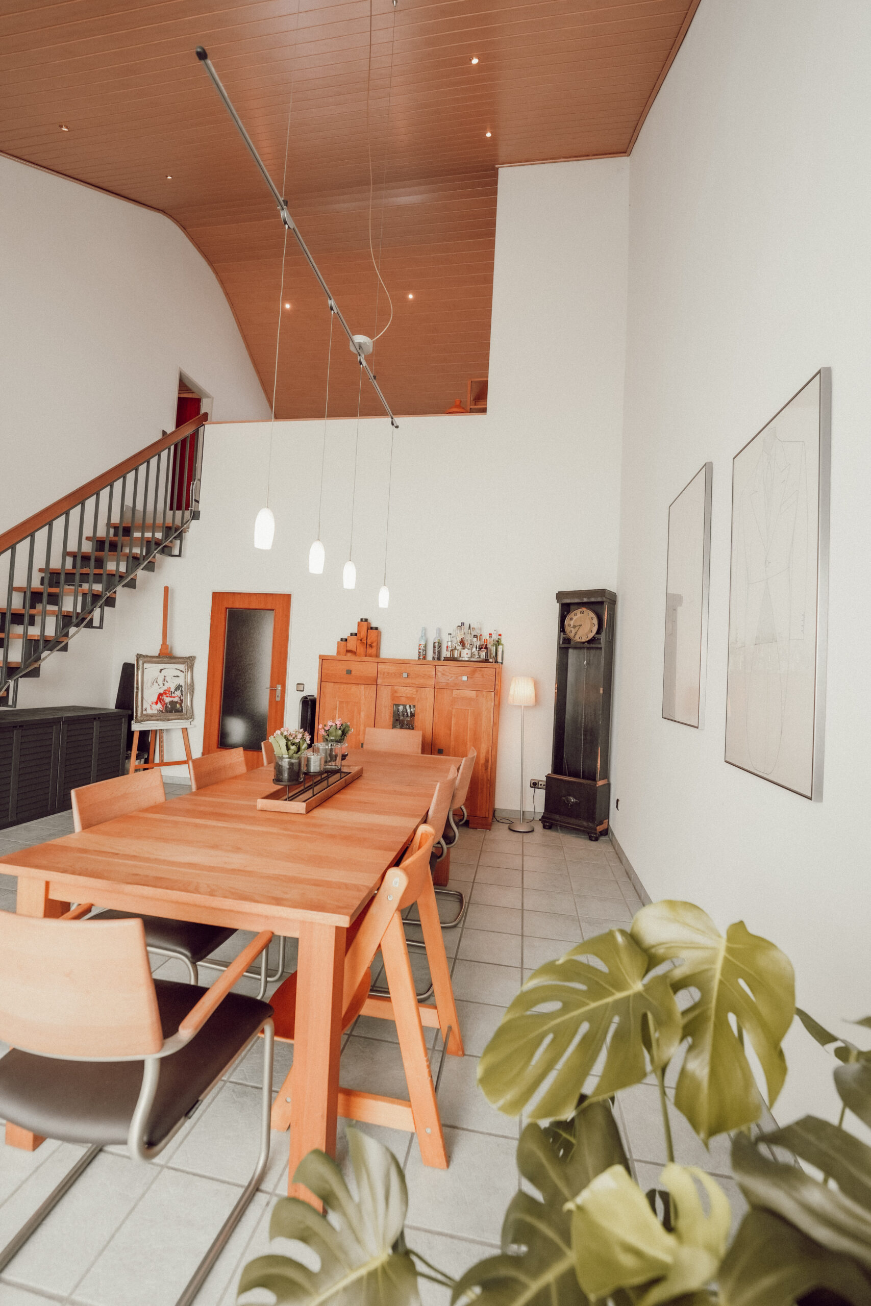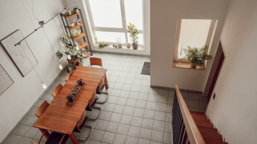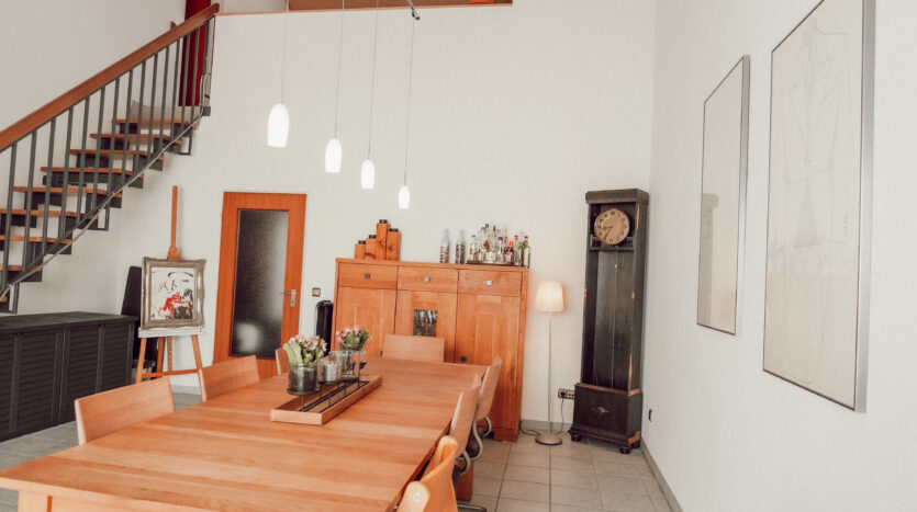 Ein helles Wohn-/Esszimmer mit Zugang zum Balkon und durch die offene Gestaltung zum Obergeschoss ein einzigartiges Raumgefühl